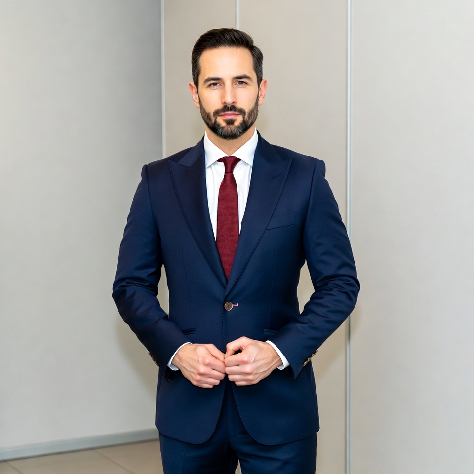 A man with short dark hair and a trimmed beard stands in a modern room with beige walls. He wears a navy blue suit, white dress shirt, and red tie, standing with hands clasped in front. His expression is confident and direct toward the camera.