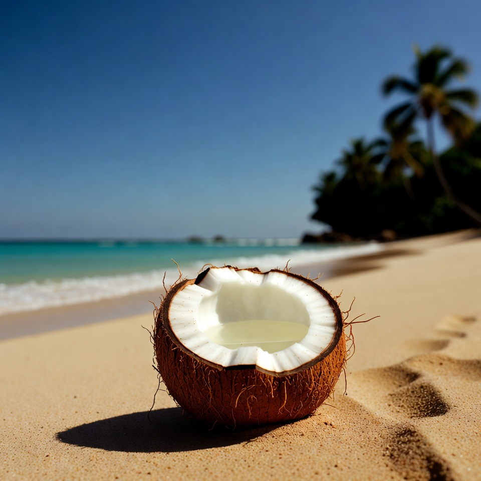 A fresh coconut with white flesh and coconut water sits open on sandy beach. Palm trees and turquoise ocean water form the background under a clear blue sky. Footprints are visible in the sand nearby.
