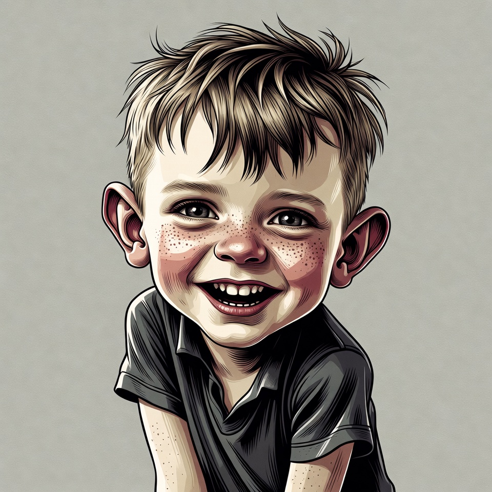 A digital illustration of a young boy with light brown tousled hair, freckles on his cheeks, and large expressive eyes smiles happily at the viewer. He wears a dark polo shirt collar and has prominent ears. The boy is depicted against a plain gray background in a detailed vector art style.