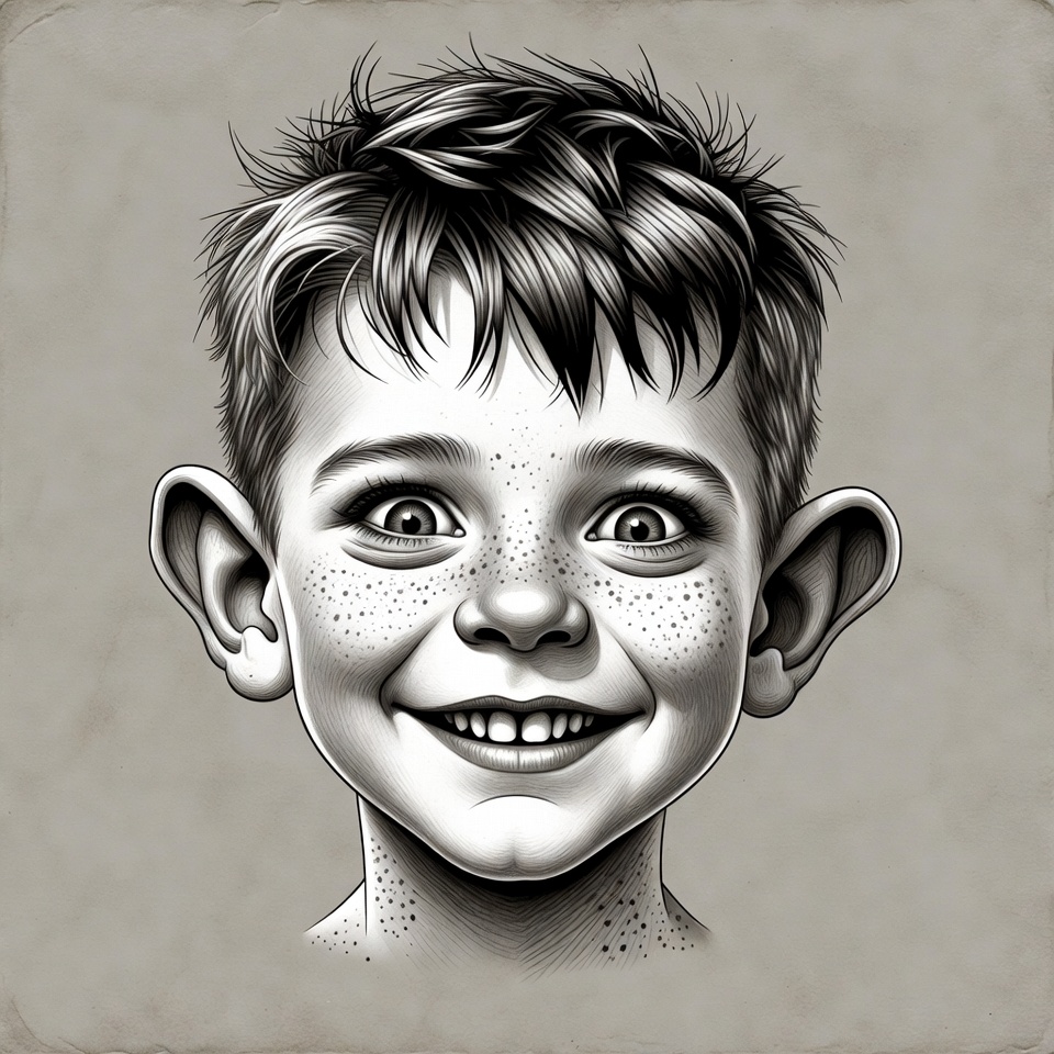 A detailed black and white illustration of a young boy with messy hair, large ears, wide eyes, and freckles across his nose. He smiles broadly, revealing his teeth, on a textured beige background. The portrait style emphasizes his expressive face and playful features.