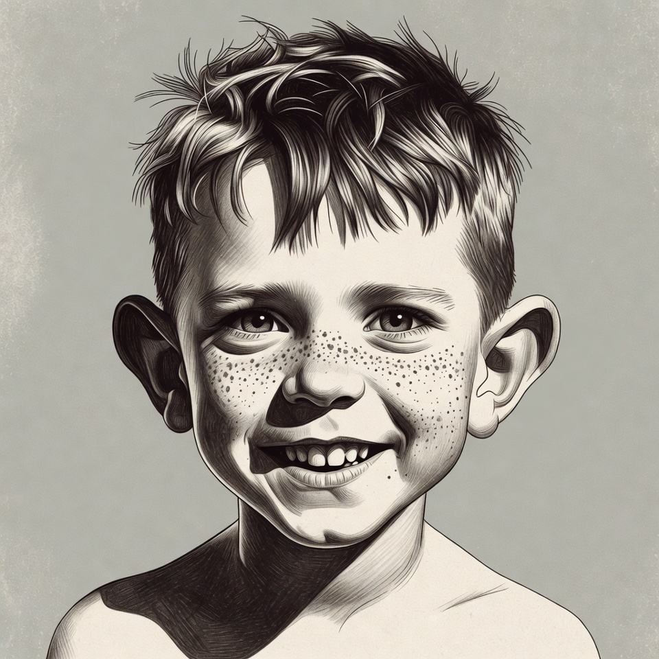 A young boy with tousled blonde hair and freckles smiles happily at the viewer. His large eyes and prominent ears are highlighted in a detailed pencil sketch style on a gray background. He is shown from the shoulders up with soft shadows adding depth.