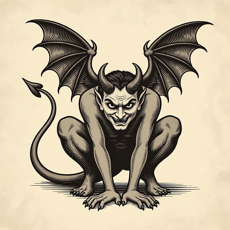 bat wings, claws, creature, crouching, demonic, devil, engraving, evil, fangs, fantasy, horns, horns, illustration, isolated background, line art, monster, snarling, squatting, tail, vintage style, wings, demon