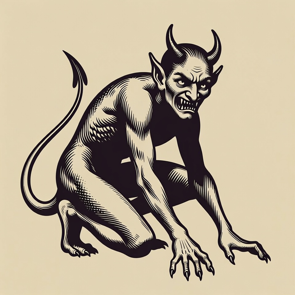 A black ink illustration of a menacing devil with curved horns, pointed ears, and sharp fangs crouches on a beige background. The creature has muscular limbs, clawed hands and feet, a long tail, and scaly skin. It snarls aggressively with glowing eyes and outstretched claws.