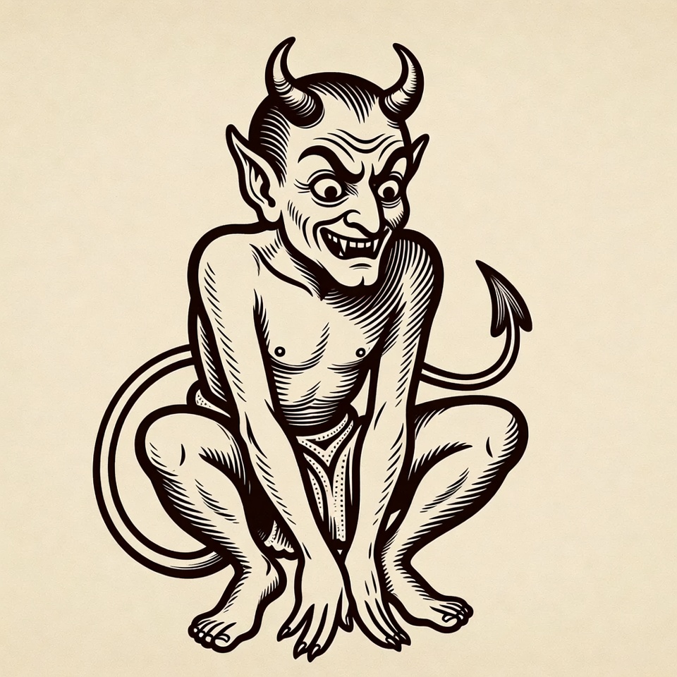 A black ink illustration of a cartoon devil with horns, pointed ears, and fangs squats on a beige background. The muscular demon has red eyes, claws, a tail, and wears a small loincloth. It grins menacingly with outstretched hands and clawed feet.