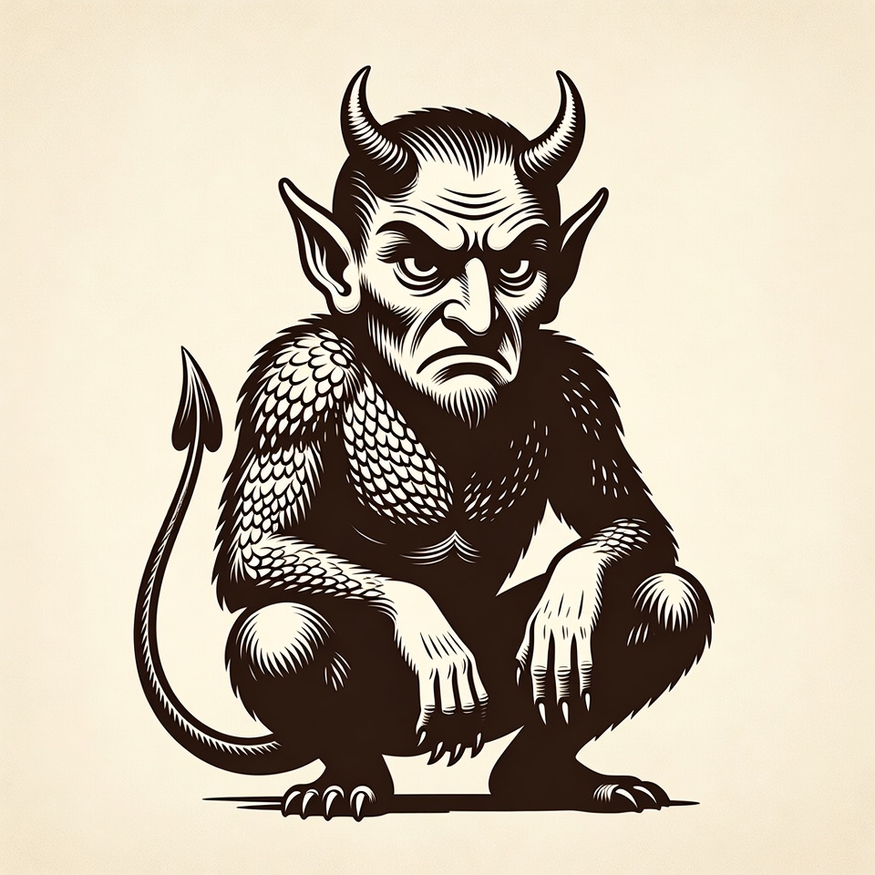 A detailed black ink illustration of a menacing devil with curved horns, pointed ears, and furrowed brows squats on beige background. It has furry arms and legs, clawed hands and feet, a spiked tail, and bat-like wings. The creature glares forward with an angry expression.