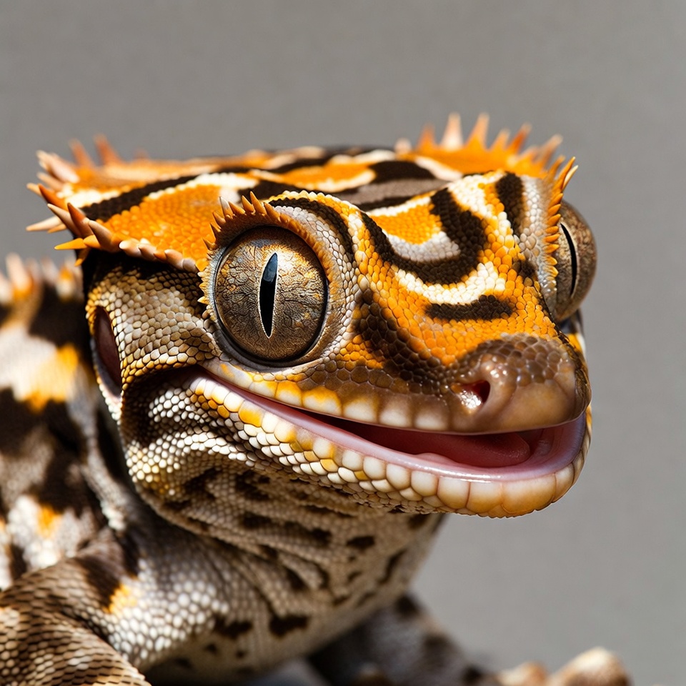 A close-up of a crested gecko features vibrant orange crests on its head and intricate black, orange, and white striped patterns on its body. The gecko stares directly at the camera with large, expressive eyes and a slight open-mouthed smile. It is positioned against a plain gray background.