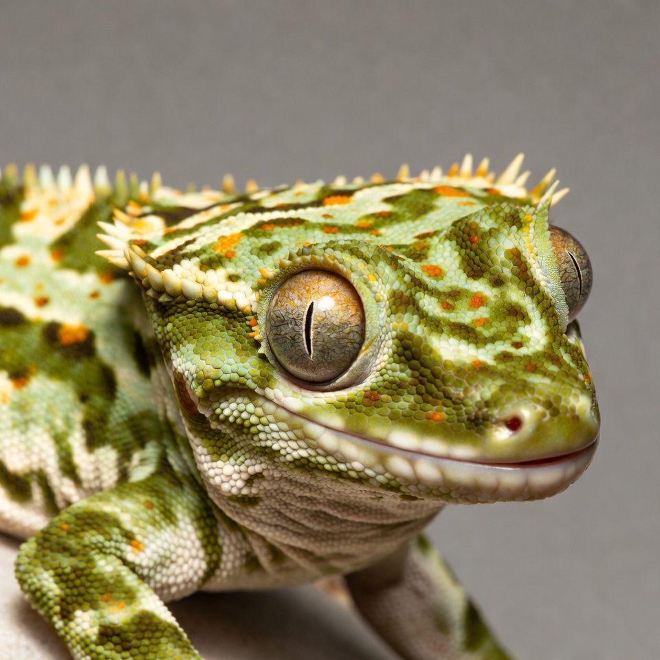 animal, close-up, exotic pet, gecko, green gecko, isolated background, large eyes, lizard, orange spots, portrait, reptile, spiny crests, vertical pupils, wildlife, crested gecko