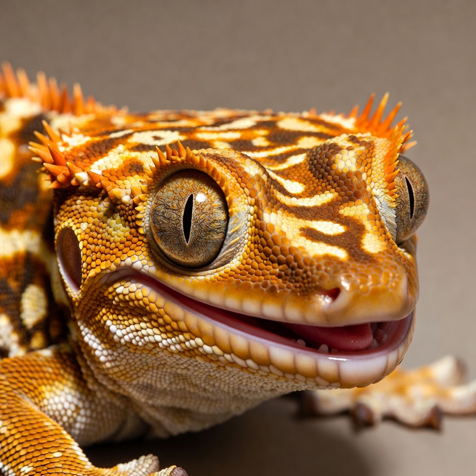amphibian-like, animal portrait, big eyes, exotic pet, gecko, isolated background, lizard, macro photo, orange gecko, patterned skin, reptile, smiling gecko, spiky crest, tongue out, wildlife, crested gecko
