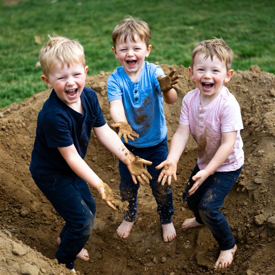 Three young boys with blonde hair laugh joyfully while playing in a large muddy pit outdoors on green grass. They wear casual short-sleeved shirts in blue and pink, along with jeans covered in mud, and reach out with muddy hands. Their bare feet are planted in the dirt as they stand together excitedly.