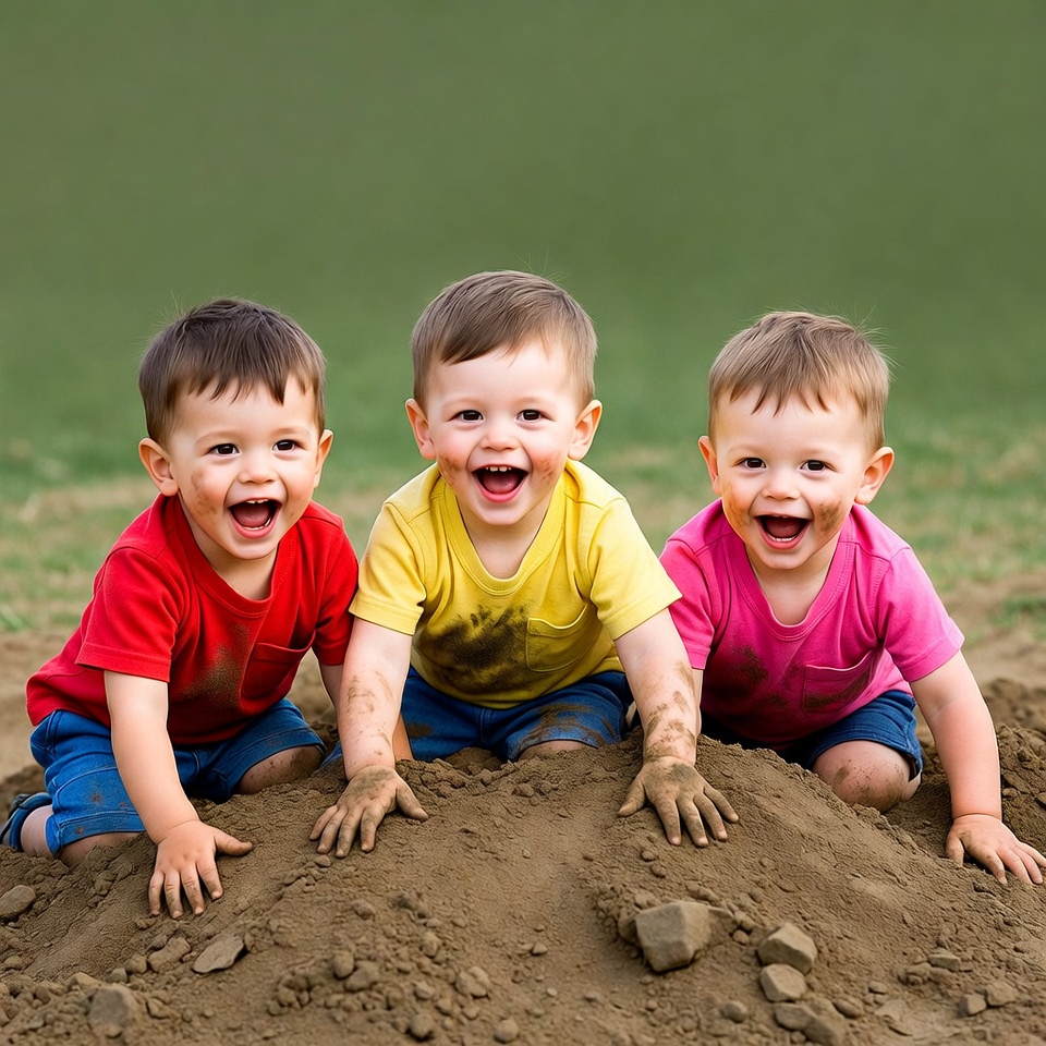 Three young boys with short brown hair laugh joyfully while digging into a large pile of dirt on green grass. The boy in the middle wears a yellow t-shirt, the left one a red t-shirt, and the right one a pink t-shirt, all with muddy clothes and hands. They kneel around the mound, covered in soil.