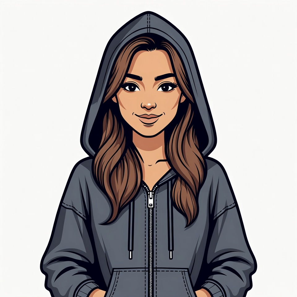A cartoon illustration of a young Asian woman with long brown hair wearing a dark gray zip-up hoodie with the hood up. She has a gentle smile, almond-shaped eyes, and stands against a white background. Her hands are in the hoodie pockets.