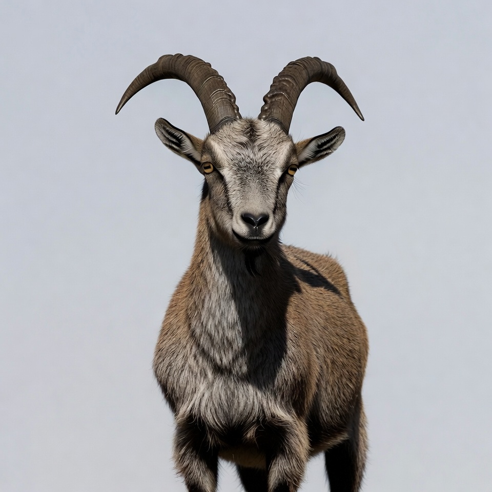 alert goat, animal, beard, brown goat, curved horns, front view, furry, gray goat, isolated background, large horns, mammal, mountain goat, standing, wildlife, yellow eyes, goat