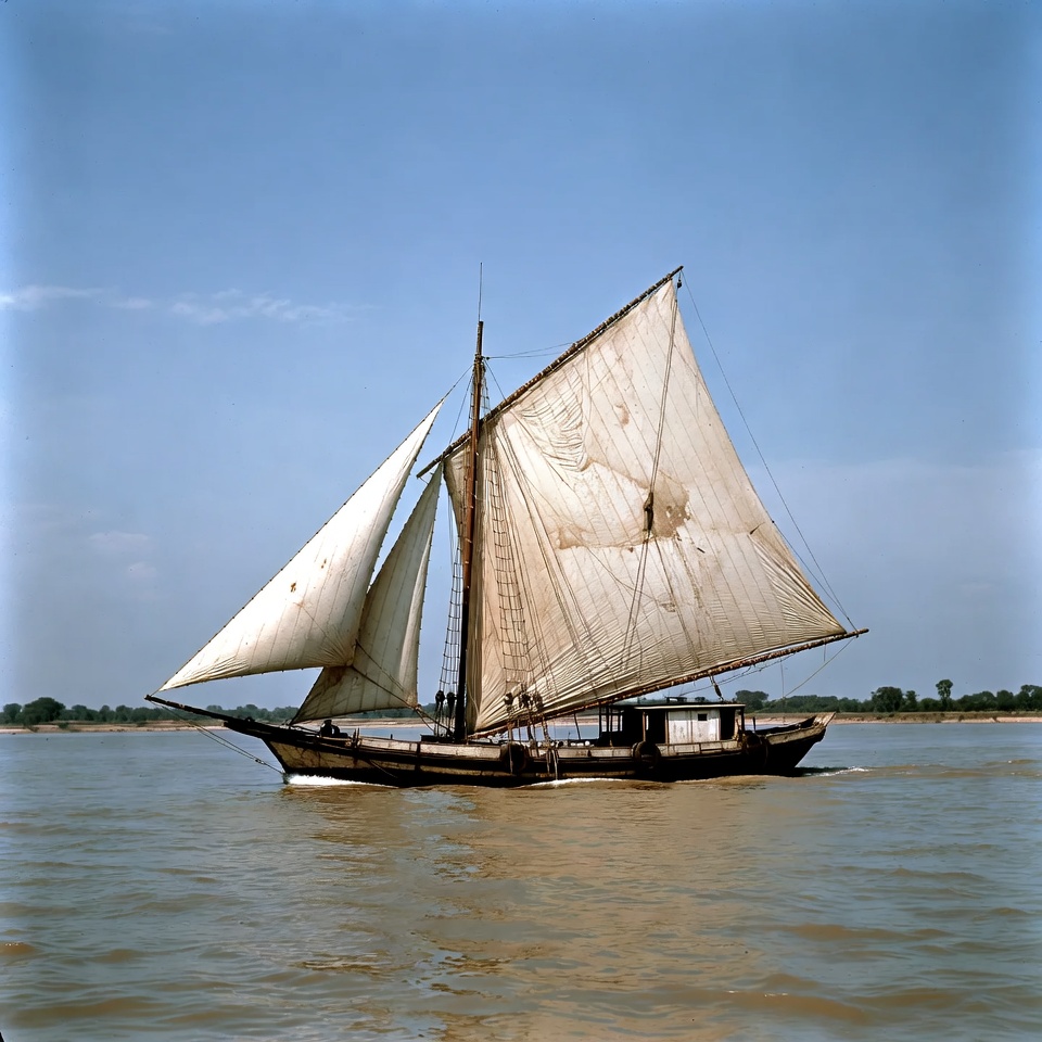 A wooden traditional sailboat with large white sails navigates down a wide river. The boat has multiple masts and a low hull, with trees lining the distant riverbanks. The water appears calm under a clear blue sky.
