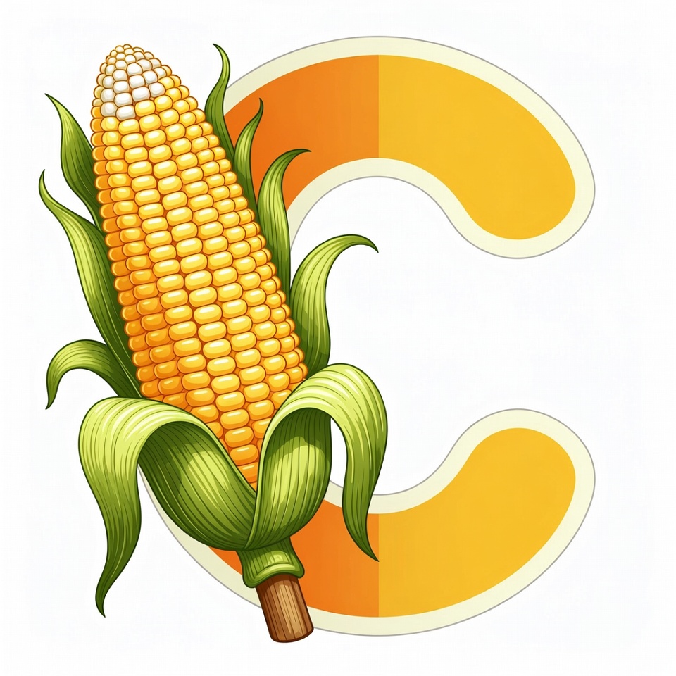 A vibrant illustration features a large ear of corn with yellow kernels and green husks attached to an orange letter C. The corn cob is positioned on the left side of the curved C shape. The design is colorful and isolated on a white background.