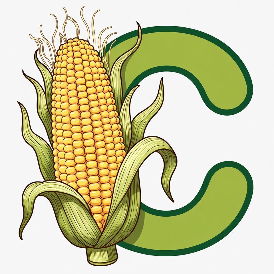 A vibrant illustration features a large yellow corn cob with green husks positioned on a bold green letter C. The corn has detailed golden kernels and curly husk strands. The design is set against a white background.