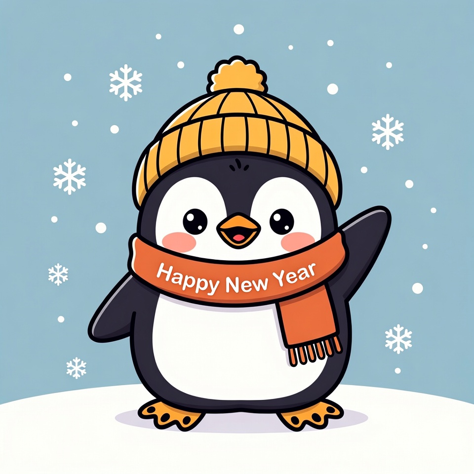 A cute cartoon penguin with big eyes wears a yellow knit hat and orange scarf on a snowy blue background. It waves one flipper happily while snowflakes fall around it. Bold text 'Happy New Year' appears on the scarf.