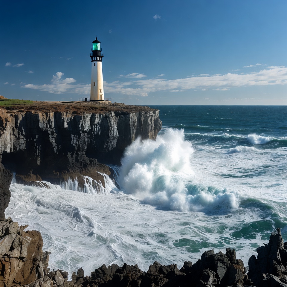 Pacific coast, blue sky, cliff, cliffside, coast, coastline, crashing waves, dramatic waves, green lantern, landmark, nature, nautical, ocean, ocean waves, outdoors, rocky cliff, sea, seascape, waves, white lighthouse, lighthouse