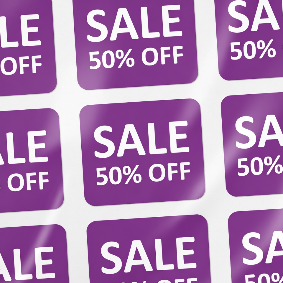 50 percent off, 50% off, bold text, discount badges, discount sale, glossy stickers, promotional stickers, purple sale, purple stickers, retail badges, sale promotion, sale signs, square stickers, white background, sale stickers