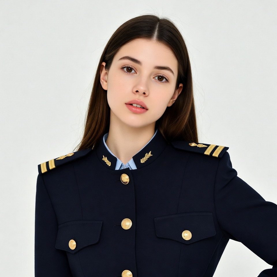 White, brown hair, collar embroidery, female, gold buttons, gold epaulets, long hair, military uniform, navy jacket, navy uniform, portrait, white background, young woman, woman