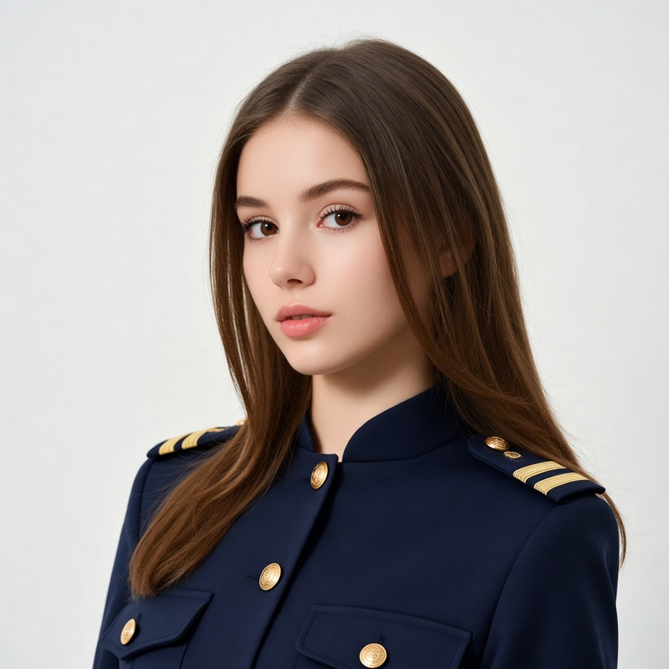 A young woman with long straight brown hair stands against a white background wearing a navy blue military-style uniform. The uniform features gold epaulets, buttons, and a collared jacket with pockets. She gazes slightly to the side with a neutral expression.