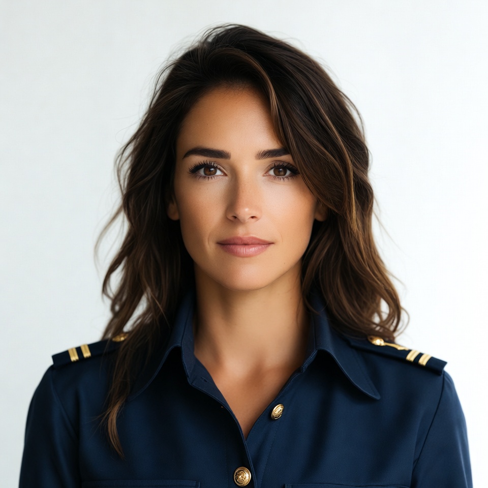 A woman with long wavy brown hair stands against a white background wearing a navy blue uniform jacket with gold epaulets and buttons. She has a direct gaze with subtle makeup and a neutral expression. The portrait focuses on her upper body and face.