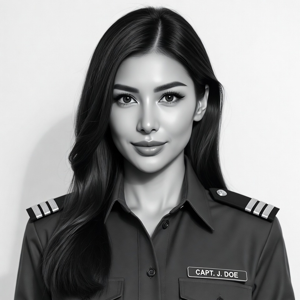 Asian, aviator, beautiful woman, black and white, captain, confident pose, dark hair, epaulets, female, glossy lips, illustration, isolated background, long hair, military uniform, name tag, officer, pilot uniform, portrait, striking eyes, uniform, woman