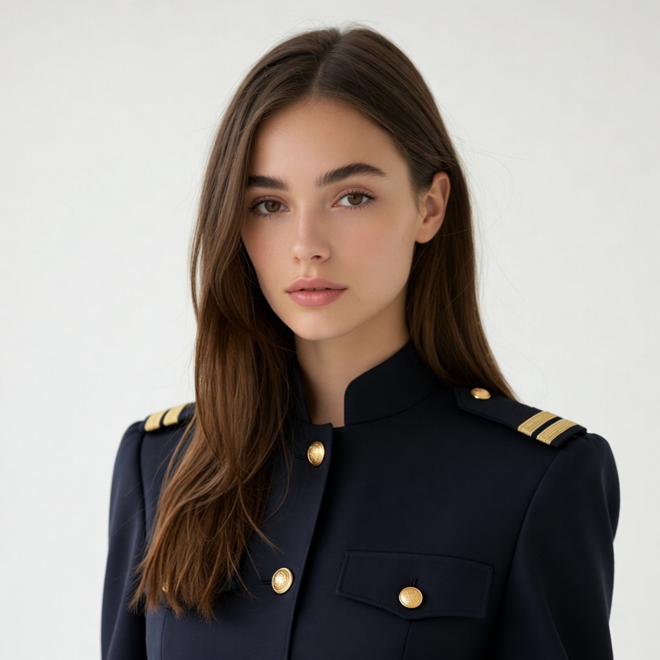 White, brown hair, collared jacket, dark hair, epaulets, female, gold buttons, long hair, military jacket, navy uniform, portrait, white background, young woman, woman