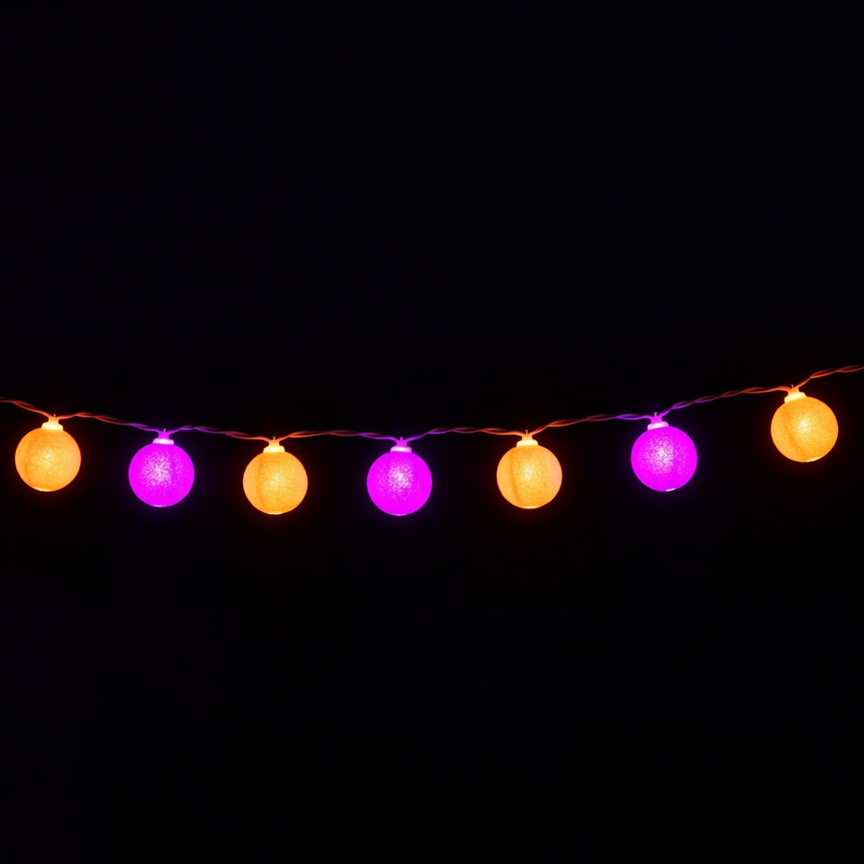 Christmas lights, LED lights, black background, decorative lights, glowing bulbs, hanging lights, holiday lights, light strand, neon lights, orange lights, party lights, purple lights, round bulbs, string lights, fairy lights
