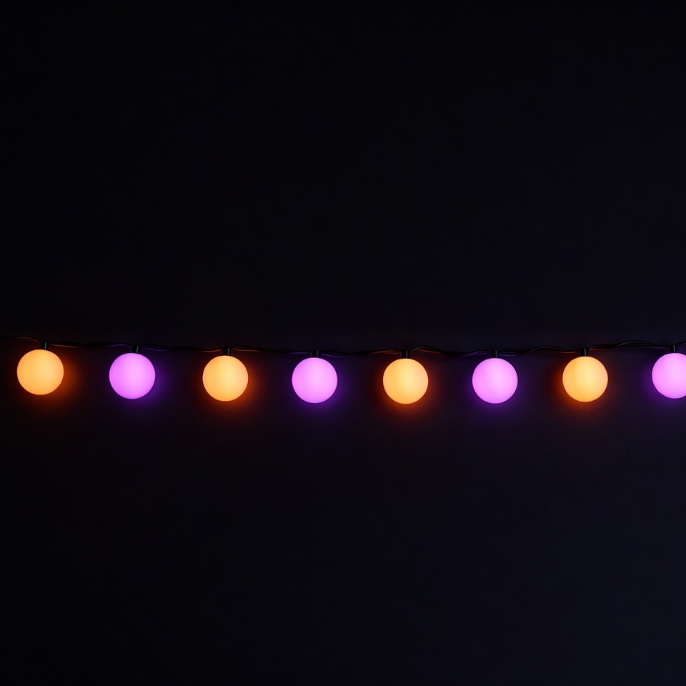 A string of glowing round fairy lights in alternating orange and purple colors hangs against a solid black background. The lights are evenly spaced and emit a soft neon glow. The isolated setup highlights the vibrant bulbs clearly.