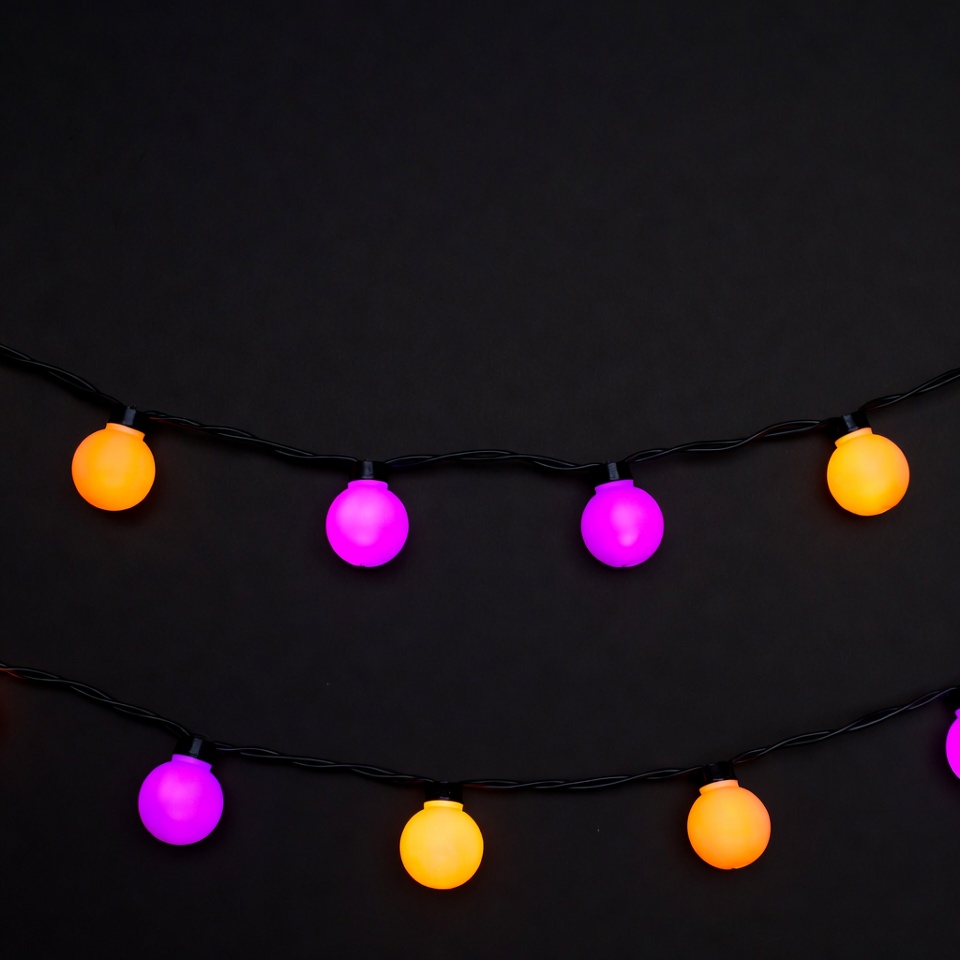 Christmas lights, LED lights, black background, bulb string, dark backdrop, fairy lights, festive decorations, glowing bulbs, holiday lights, isolated, neon lights, orange lights, party lights, purple lights, string lights