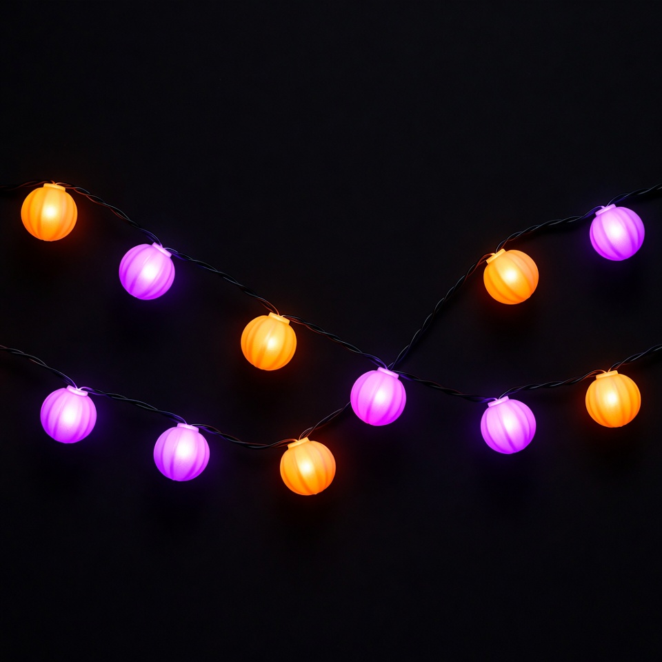 Halloween decorations, LED lights, black background, festive lights, glowing bulbs, hanging lights, holiday decorations, isolated background, lantern lights, orange lights, party lights, pumpkin lights, purple lights, string lights, Halloween lights
