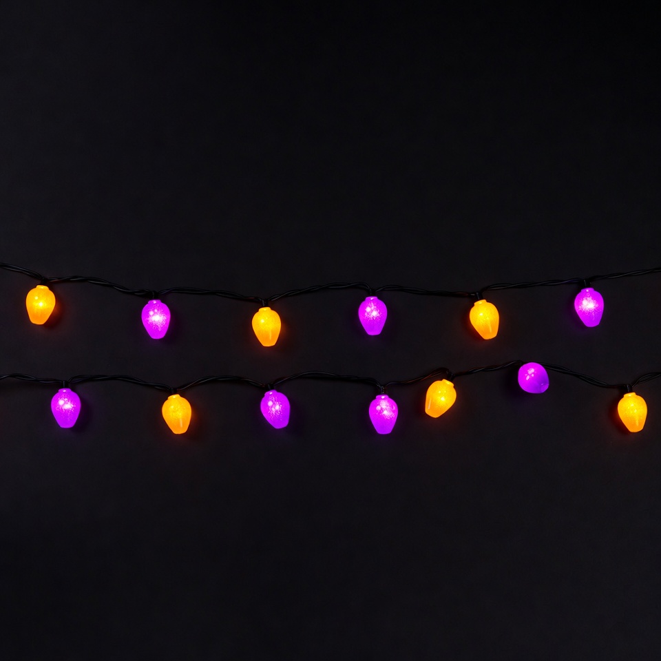 Halloween decoration, Halloween lights, black background, bulb string, carved pumpkins, fairy lights, festive lights, glowing bulbs, holiday lights, isolated, jack o lantern lights, neon glow, orange lights, orange pumpkins, party lights, pumpkin string, purple lights, purple pumpkins, string lights, pumpkin lights