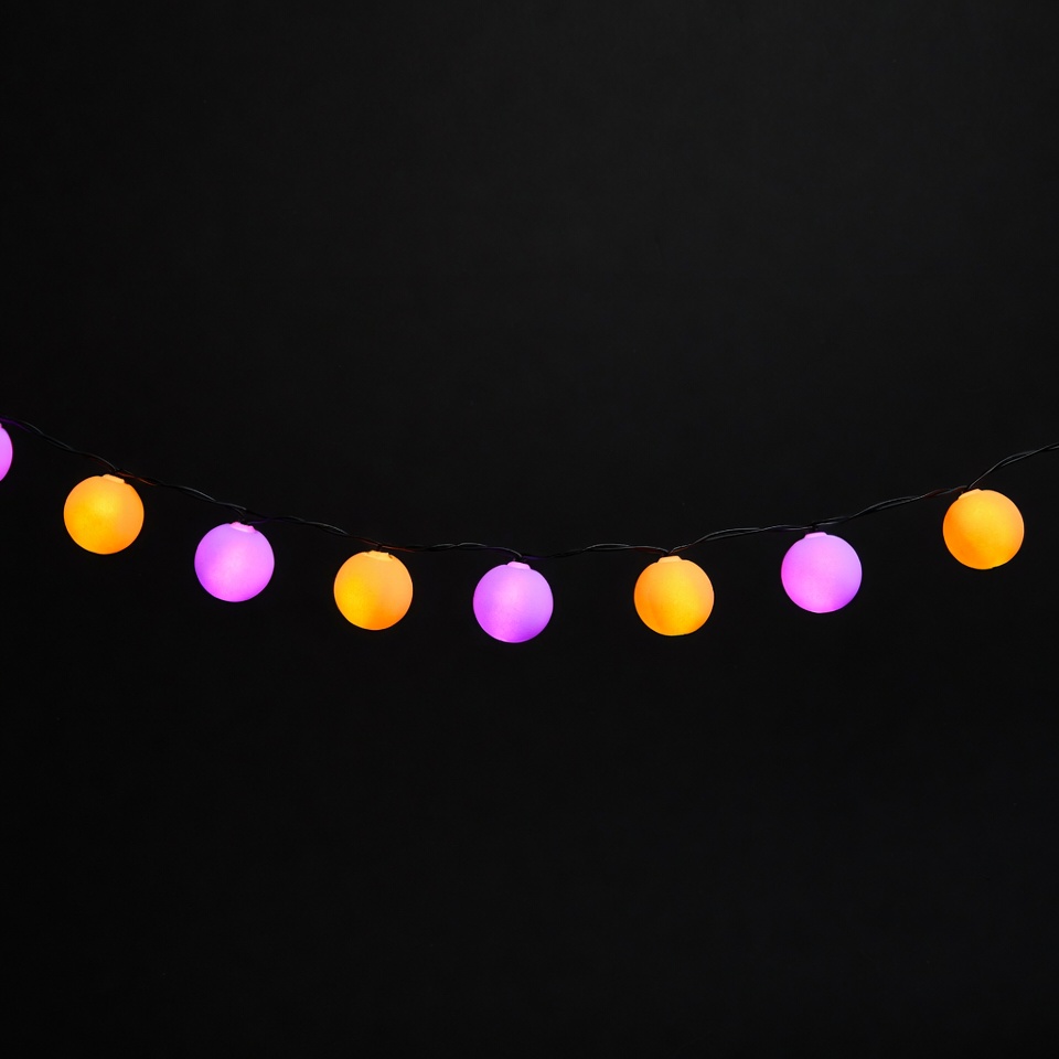 A string of glowing round fairy lights in orange and purple hues hangs against a solid black background. The lights are evenly spaced along the wire, creating a festive garland effect. Each bulb emits a soft neon glow.