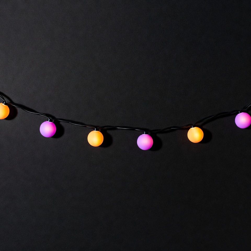 Christmas lights, LED lights, black background, colorful lights, decoration, glowing bulbs, hanging lights, holiday lights, isolated background, neon glow, orange lights, party lights, purple lights, round bulbs, string lights, fairy lights