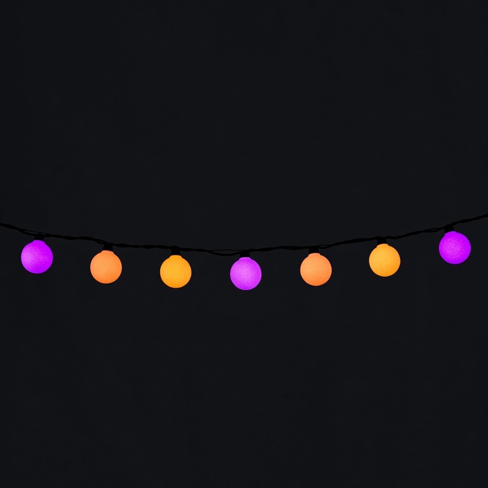 LED lights, black background, decoration, festive string, glowing bulbs, hanging lights, holiday lights, neon lights, orange lights, party lights, purple lights, round bulbs, string lights, vibrant colors, fairy lights