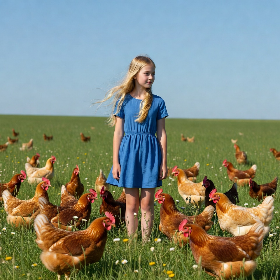 A young blonde girl in a blue dress stands in a green field surrounded by a flock of brown chickens. Her hair flows in the wind under a clear blue sky. The chickens circle around her on the grass.