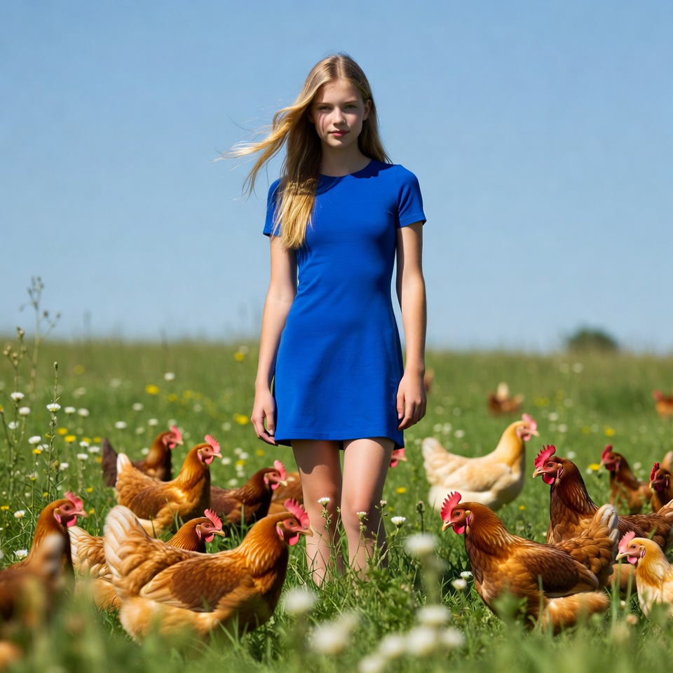 White, animals, blonde hair, blue dress, blue sky, chickens, farm, female, field, flock, flowers, flowing hair, grass, green field, hens, outdoors, poultry, rural, short dress, smile, standing, sunny day, young girl, girl