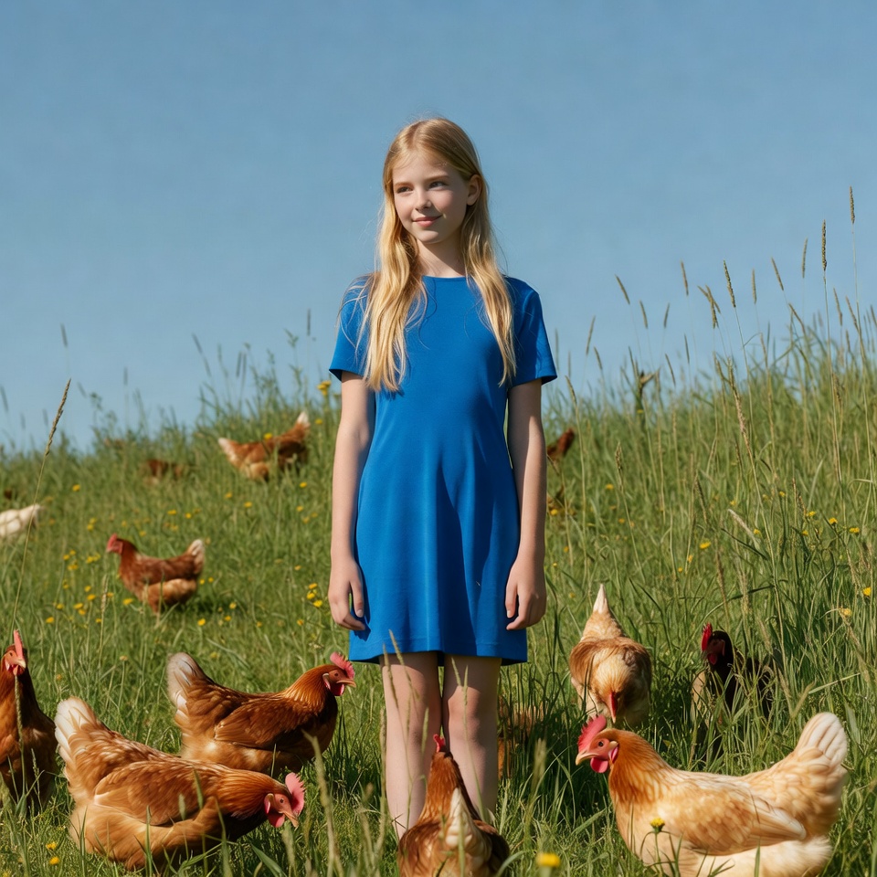 White, animals, blonde hair, blue dress, blue sky, brown chickens, chickens, farm, female, field, grass, green field, hens, long hair, nature, outdoor, poultry, rural, short dress, smiling, standing, summer, young girl, girl