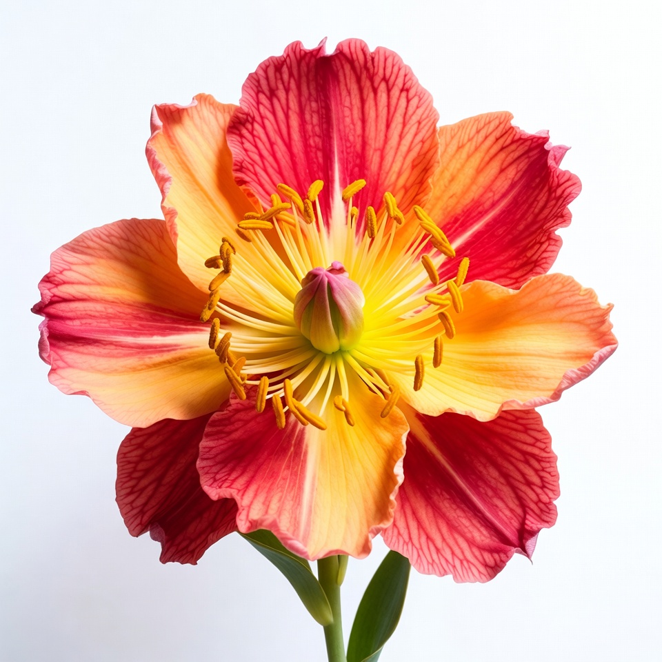 bloom, close-up, exotic flower, floral, flower, garden flower, green stem, isolated background, lily flower, macro flower, orange flower, petals, pink bud, red flower, ruffled petals, stamen, vibrant flower, white background, yellow center, daylily