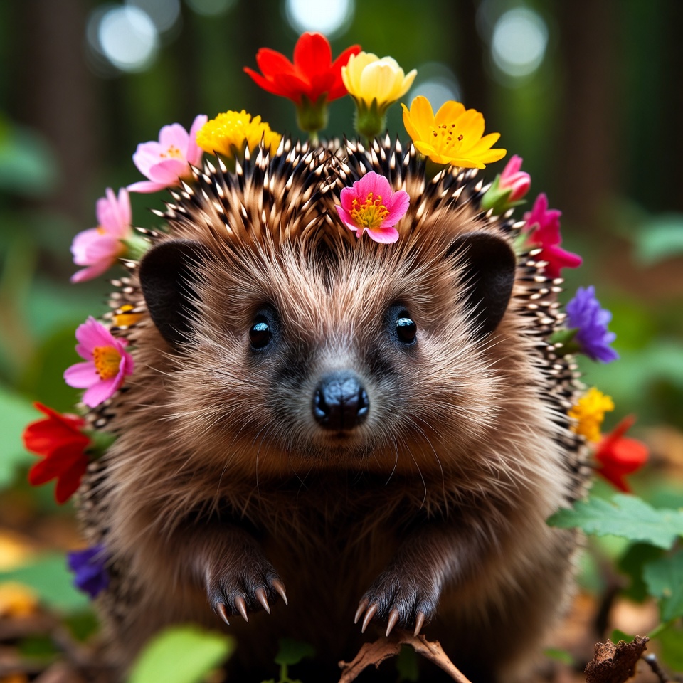 adorable animal, animal portrait, big eyes, bokeh background, colorful flowers, cute hedgehog, flower crown, flowers, forest background, green forest, nature, petals, pink flowers, purple flowers, red flowers, spines, wild animal, wildlife, yellow flowers, hedgehog