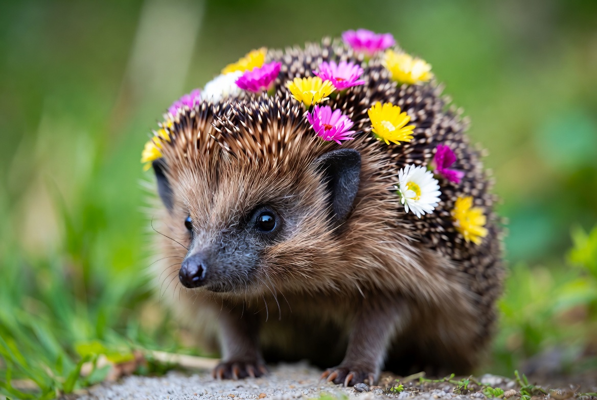 A cute hedgehog stands on green grass with its quills adorned by vibrant flowers in pink, yellow, and white. The flowers form a crown around its head and back. It faces forward with a curious expression against a blurred green background.