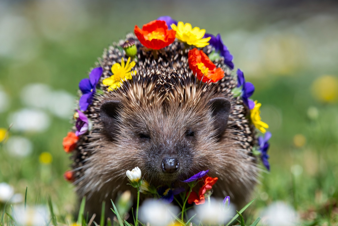 animal, colorful flowers, cute hedgehog, daisies, flower crown, grass background, isolated background, nature, orange flowers, pet hedgehog, purple flowers, red flowers, violets, wildlife, yellow flowers, hedgehog