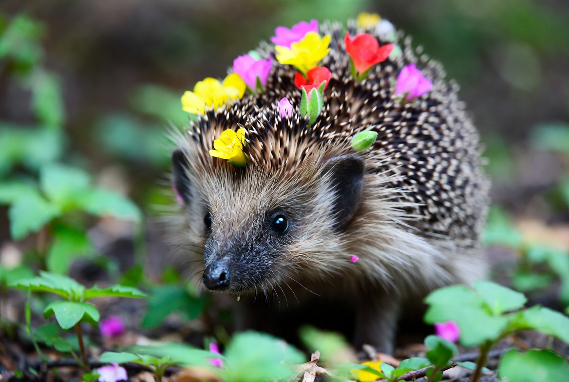 adorable hedgehog, animal, colorful flowers, cute animal, flower crown, flowers, forest floor, grass, green flowers, green grass, leaves, nature, pink flowers, red flowers, spines, wildlife, yellow flowers, hedgehog