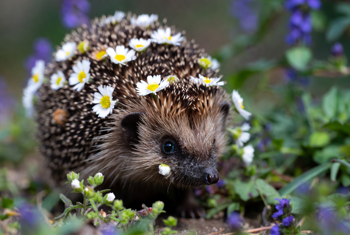 adorable, animal, closeup, cute animal, daisies, european hedgehog, flower crown, flowers, garden, green grass, nature, outdoor, purple flowers, spines, white flowers, wild animal, wildlife, hedgehog