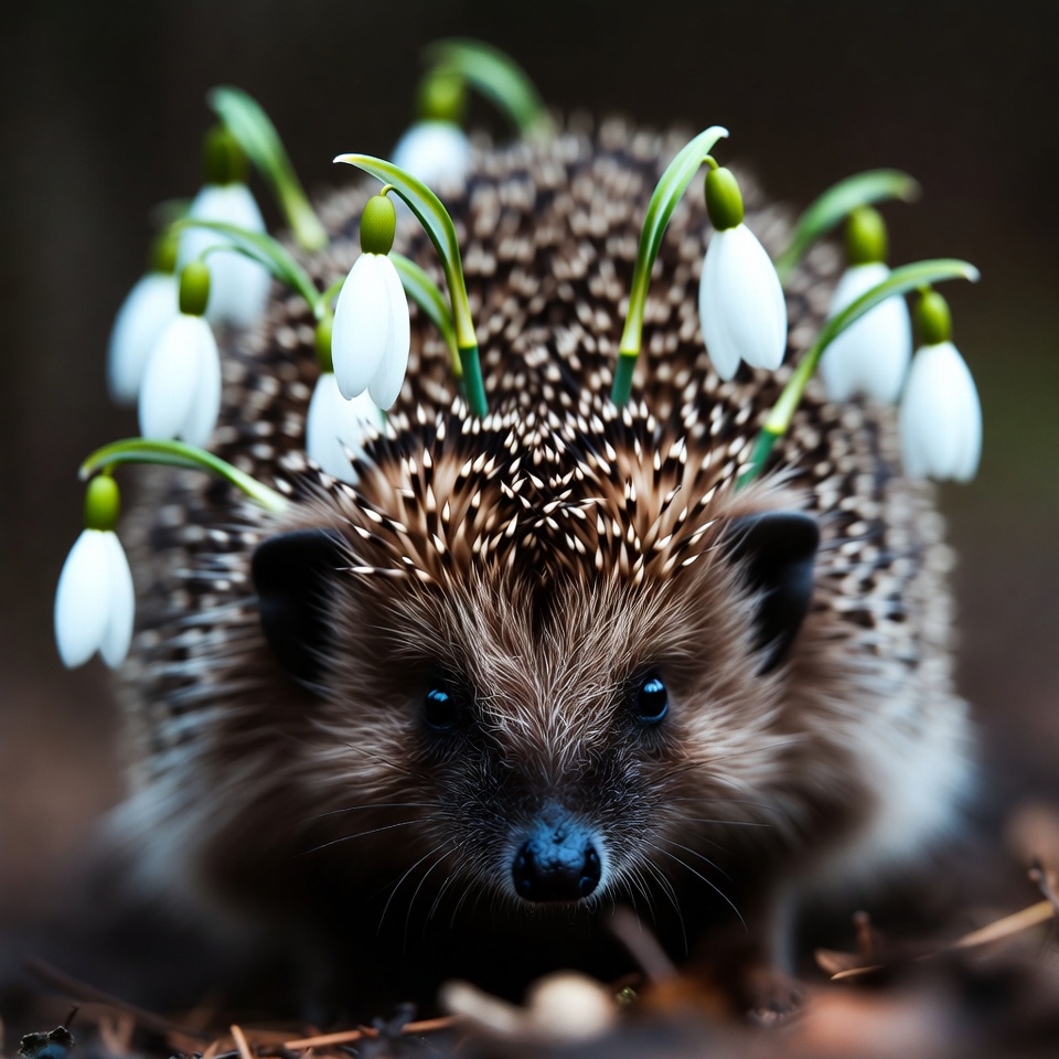 adorable hedgehog, animal photography, animal portrait, closeup, cute animal, dark background, european hedgehog, flower crown, forest animal, green stems, nature, petals, quills, snowdrop flowers, spiny mammal, spring flowers, white flowers, wildlife, hedgehog