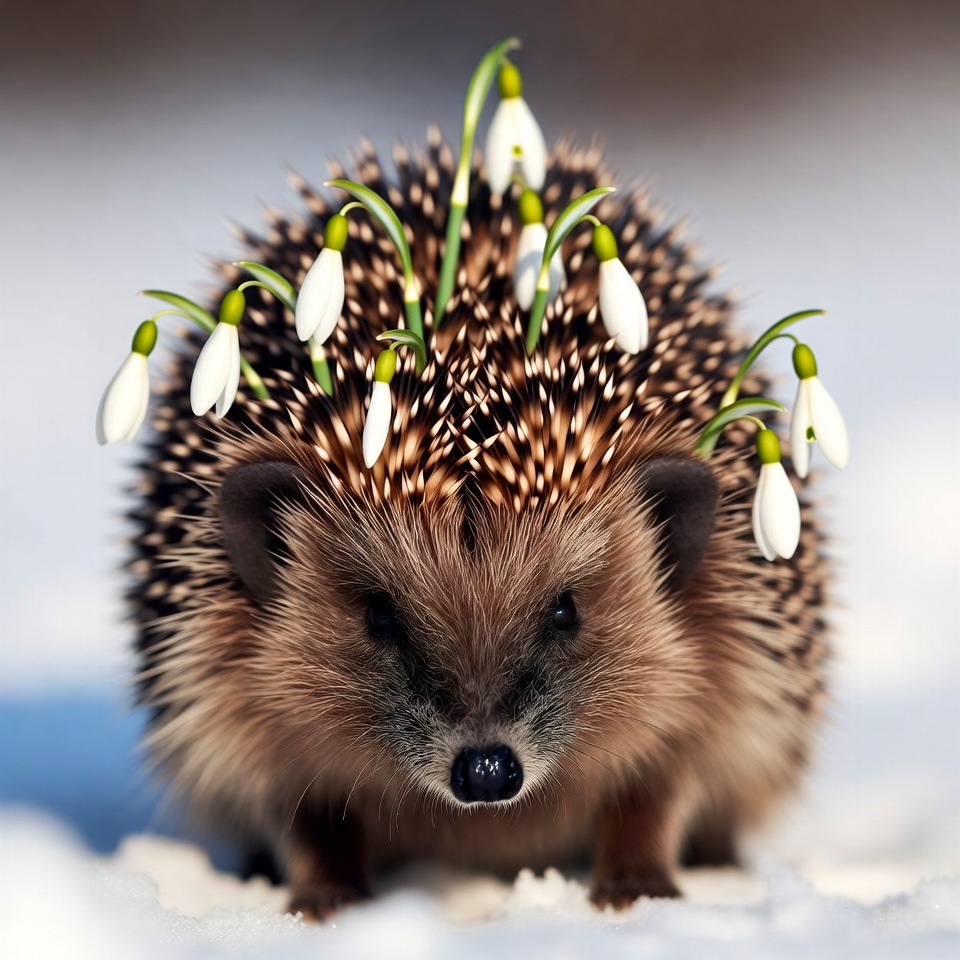 A cute hedgehog sits on snow with multiple snowdrop flowers sprouting from its spines. The white bell-shaped flowers contrast against the hedgehog's brown quills and black face. The scene features a snowy background highlighting the spring-like growth.