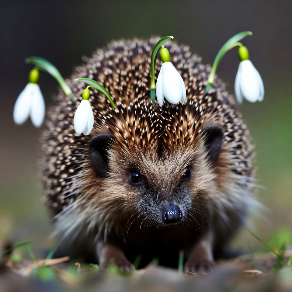 adorable, animal portrait, cute animal, european hedgehog, flower crown, grass, green background, nature, quills, snowdrop flowers, spines, spring flowers, white flowers, wildlife, hedgehog