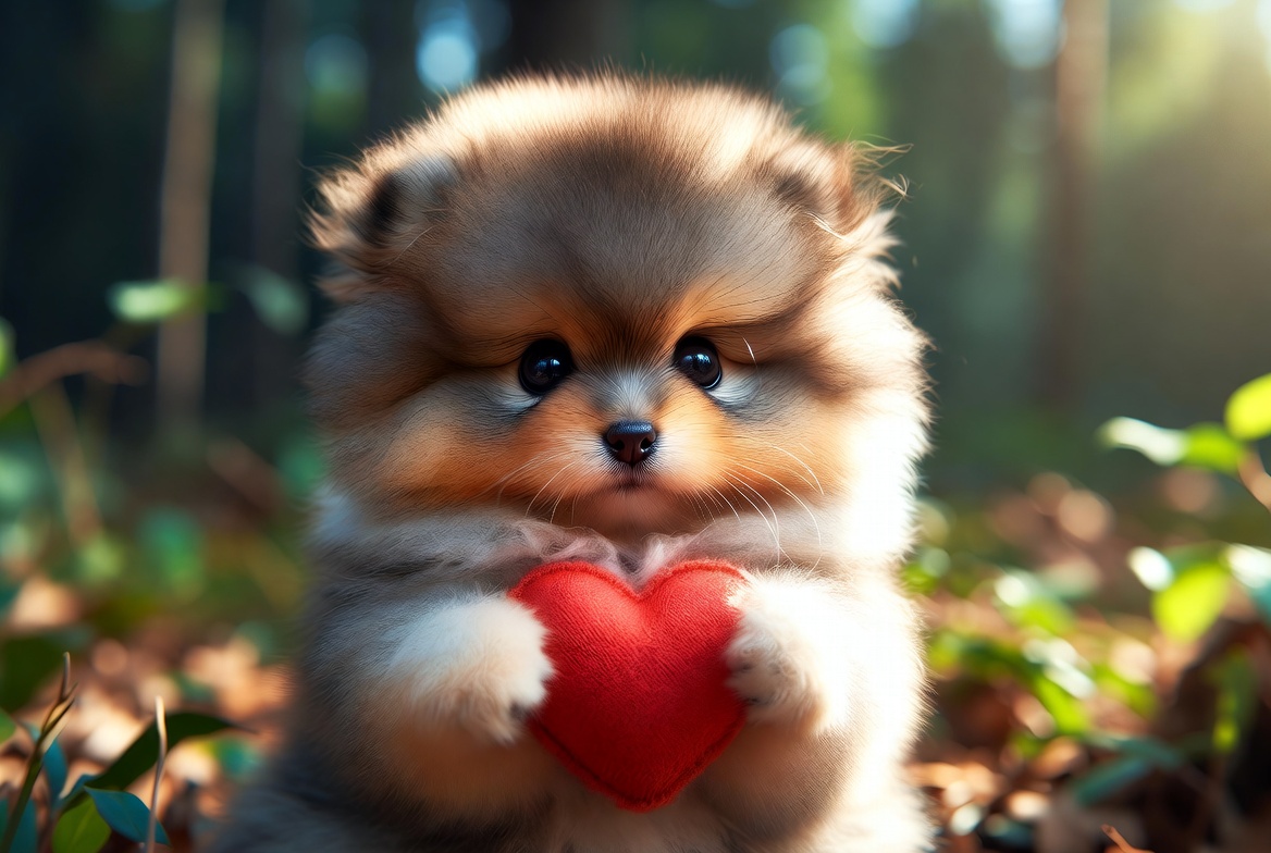 A fluffy Pomeranian puppy with tan and white fur sits in a lush green forest holding a large red heart in its paws. Sunlight filters through the trees, illuminating the puppy's big expressive eyes and soft fur. Green leaves and forest floor surround the adorable scene.