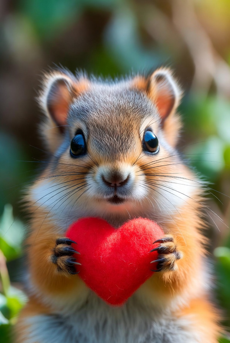 A fluffy squirrel with large expressive eyes holds a bright red heart-shaped plush toy in its paws. It stands against a blurred green leafy background with soft sunlight filtering through. The squirrel's fur is reddish-brown with gray accents, and it has a gentle smiling expression.