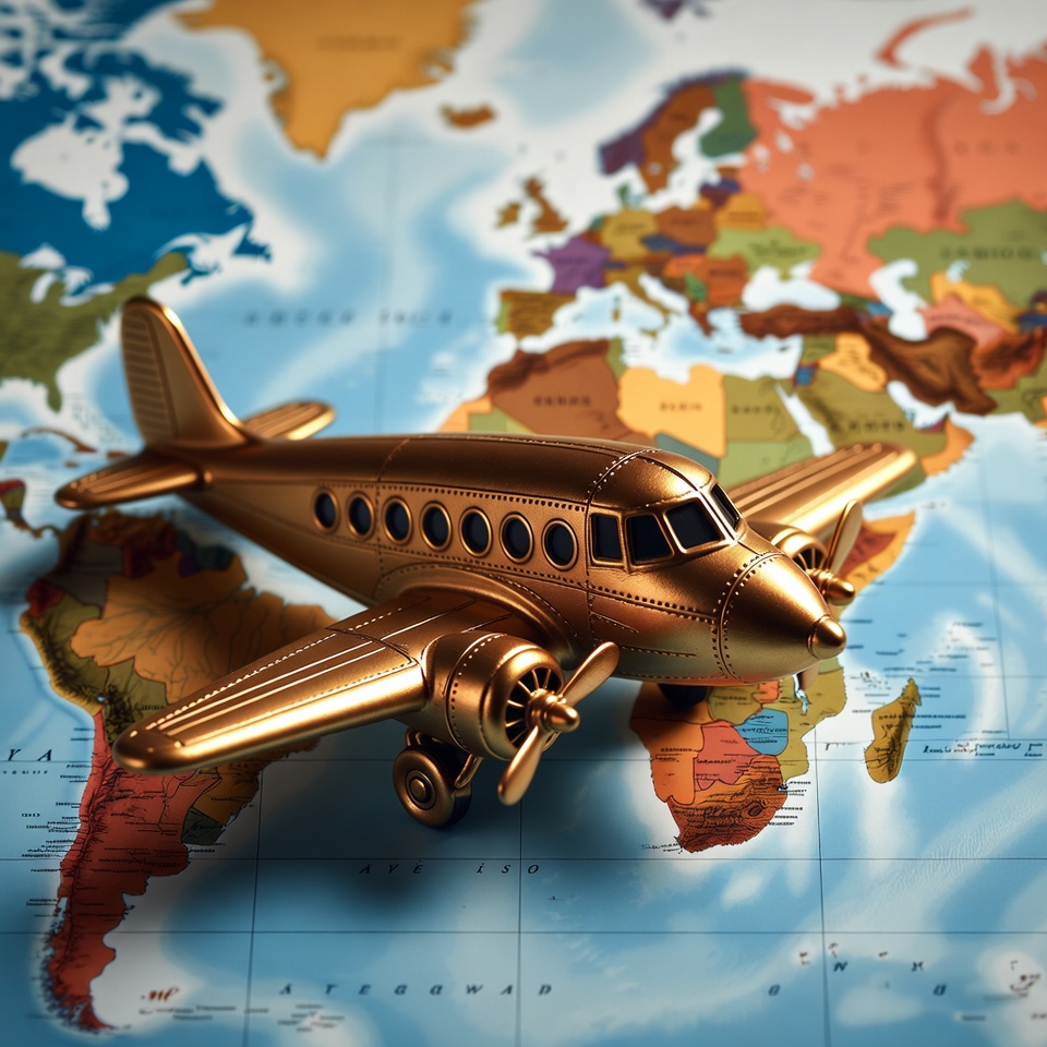 A small golden toy airplane with propellers sits on a colorful world map. The detailed map shows continents like Africa, Europe, and Asia in various shades. The airplane appears ready for takeoff against the blue ocean background.